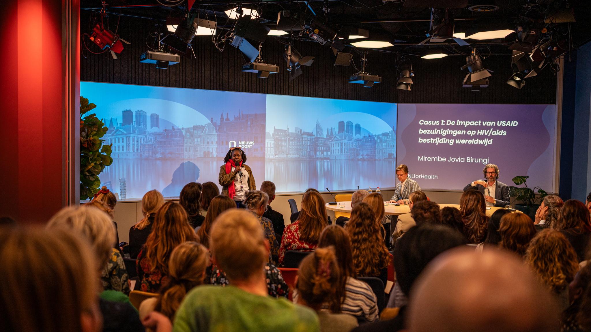 Next, Mirembe Jovia Birungi (Global Fund Advocates Network) introduced the first case, on the impact of the USAID budget cuts on the global HIV/AIDS response. In her remarks, she emphasized that political decisions can have far-reaching consequences for people’s health, in the Netherlands and abroad. “If you already know who you’ll be voting for, ask them to stand up for the financing of global health. Because viruses don’t need a visa,” she said.